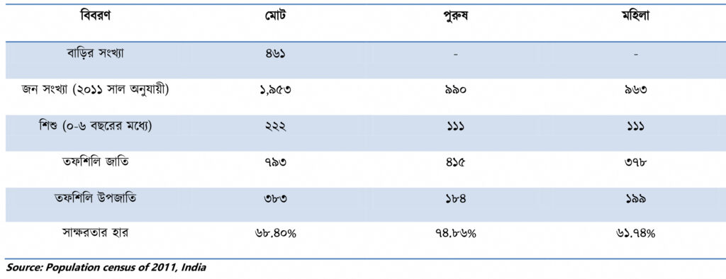āĻāĻžāύāĻ āĻā§āϰāĻžāĻŽā§ āϤā§āϞāύāĻžāĻŽā§āϞāĻāĻāĻžāĻŦā§ āĻāĻŽ āĻāύāϏāĻāĻā§āϝāĻž āϰā§ā§āĻā§, āϝā§āĻāĻžāύ⧠āĻĒā§āϰā§āώ, āĻŽāĻšāĻŋāϞāĻž āĻāĻŦāĻ āĻļāĻŋāĻļā§ āĻāύāϏāĻāĻā§āϝāĻžāϰ āύāĻŋāϰā§āĻĻāĻŋāώā§āĻ āĻŦāĻŋāĻāĻžāĻāύ āϰā§ā§āĻā§, āĻĒāĻžāĻļāĻžāĻĒāĻžāĻļāĻŋ āϤāĻĢāϏāĻŋāϞāĻŋ āĻāĻžāϤāĻŋ (SC) āĻ āϤāĻĢāϏāĻŋāϞāĻŋ āĻāĻĒāĻāĻžāϤāĻŋ (ST) āĻŦāĻžāϏāĻŋāύā§āĻĻāĻžāĻĻā§āϰ āĻāϞā§āϞā§āĻāϝā§āĻā§āϝ āĻŦā§āĻĻā§āϧāĻŋ āϞāĻā§āώā§āϝ āĻāϰāĻž āϝāĻžā§āĨ¤ āĻāĻ āĻā§āϰāĻžāĻŽā§ āϏāĻžāĻā§āώāϰāϤāĻžāϰ āĻšāĻžāϰ āĻŽāĻžāĻāĻžāϰāĻŋ (āĻĒā§āϰāĻžā§ ā§Ŧā§Ļ â ā§ā§Ļ%), āĻĒā§āϰā§āώāĻĻā§āϰ āϤā§āϞāύāĻžā§ āĻŽāĻšāĻŋāϞāĻžāĻĻā§āϰ āϏāĻžāĻā§āώāϰāϤāĻžāϰ āĻšāĻžāϰ āϏāĻžāϧāĻžāϰāĻŖāϤ āĻāĻŽ, āϝāĻž āĻļāĻŋāĻā§āώāĻžāĻāϤ āĻāύā§āύā§āύā§āϰ āϏāĻŽā§āĻāĻžāĻŦā§āϝ āĻā§āώā§āϤā§āϰāĻā§āϞāĻŋāĻā§ āύāĻŋāϰā§āĻĻā§āĻļ āĻāϰā§āĨ¤ āĻāϤ⧠āĻāĻŋāĻā§ āĻŦāĻžāϧāĻž â āĻŦāĻŋāĻĒāϤā§āϤāĻŋ āĻĨāĻžāĻāĻž āϏāϤā§āϤā§āĻŦā§āĻ āĻāĻŽāĻŋ āĻŽāύ⧠āĻāϰāĻŋ, āĻāĻ āĻā§āϰāĻžāĻŽ āĻāĻāĻĻāĻŋāύ āϤāĻžāϰ āĻļāĻā§āϤāĻŋāĻļāĻžāϞ⧠āĻĒāϰāĻŋāĻāĻžāĻ āĻžāĻŽā§, āĻāϤāĻŋāĻšā§āϝ āĻāĻŦāĻ āĻāϧā§āύāĻŋāĻā§āĻāϰāĻŖāĻā§ āĻšāĻžāϤāĻŋā§āĻžāϰ āĻāϰ⧠āĻāύā§āύāϤ āĻā§āϰāĻžāĻŽā§ āĻĒāϰāĻŋāĻŖāϤ āĻšāĻŦā§āĨ¤